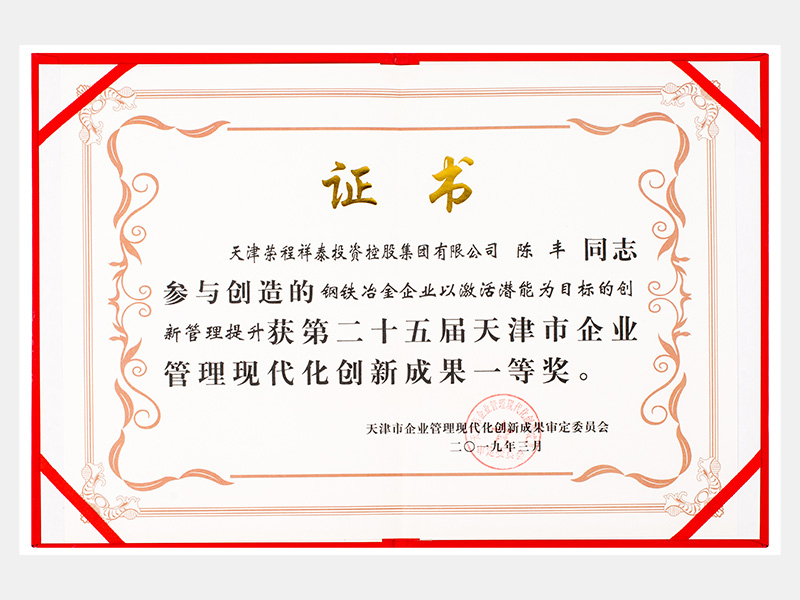 陳豐同志參與創造的鋼鐵冶金企業以激活潛能為目標的創新管理提升獲第二十五屆天津市企業管理現代化創新成果一等獎。